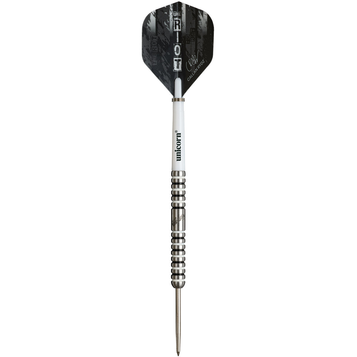 The Callan Rydz Phase 2 darts are 90% Tungsten barrels, finished with his iconic 'The Riot' logo and black and white stripes - a nod to his hometown of Newcastle. The barrels are complimented by the Gripper 4 White shafts, Callan's new Ultrafly flight and Unicorn's patented Volute points which provide incredible grip in the board, without leaving any damage!