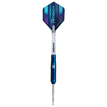 The Unicorn Prodigy Dart is a game-changer for the next generation of players taking their first steps towards darting excellence. Available in two different barrel profiles - parallel and torpedo - the Prodigy combines a cool and vibrant navy blue PVD titanium coating finish with cutting-edge machining to create a dart perfect for beginners. Its 95% tungsten barrel construction allows a 20% smaller dart than standard 90% tungsten barrels for easier handling while increasing its density to deliver a heavier dart to enhance throwing speed for greater accuracy. The patented Volute™ offers superb sisal grip to reduce bounce-outs and minimise sisal damage to extend the life of your dartboard. Take your game to the next level with the Prodigy today.