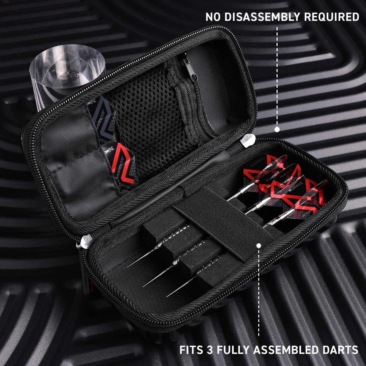 Engineered to hold one set of fully assembled darts, plus five dedicated pockets for flights and nine dedicated pockets for shafts, it keeps your entire setup secure and organised. The ultra-modern, robust construction offers maximum protection against impact and wear - perfect for players on the move.